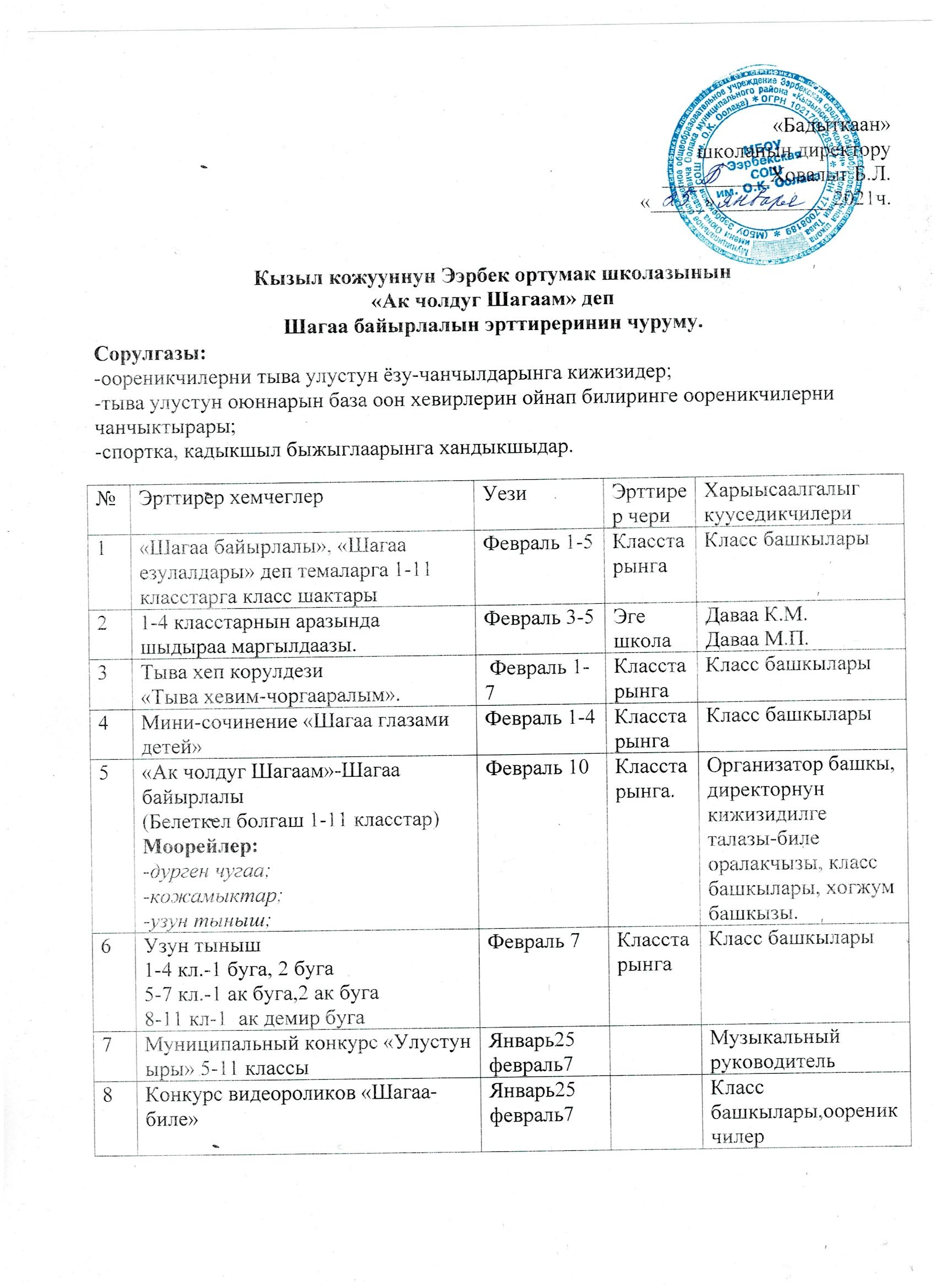 мероприятий в рамках ПРАЗДНОВАНИЯ МЕСЯЧНИКА «ШАГАА-БИЛЕ 2021»
