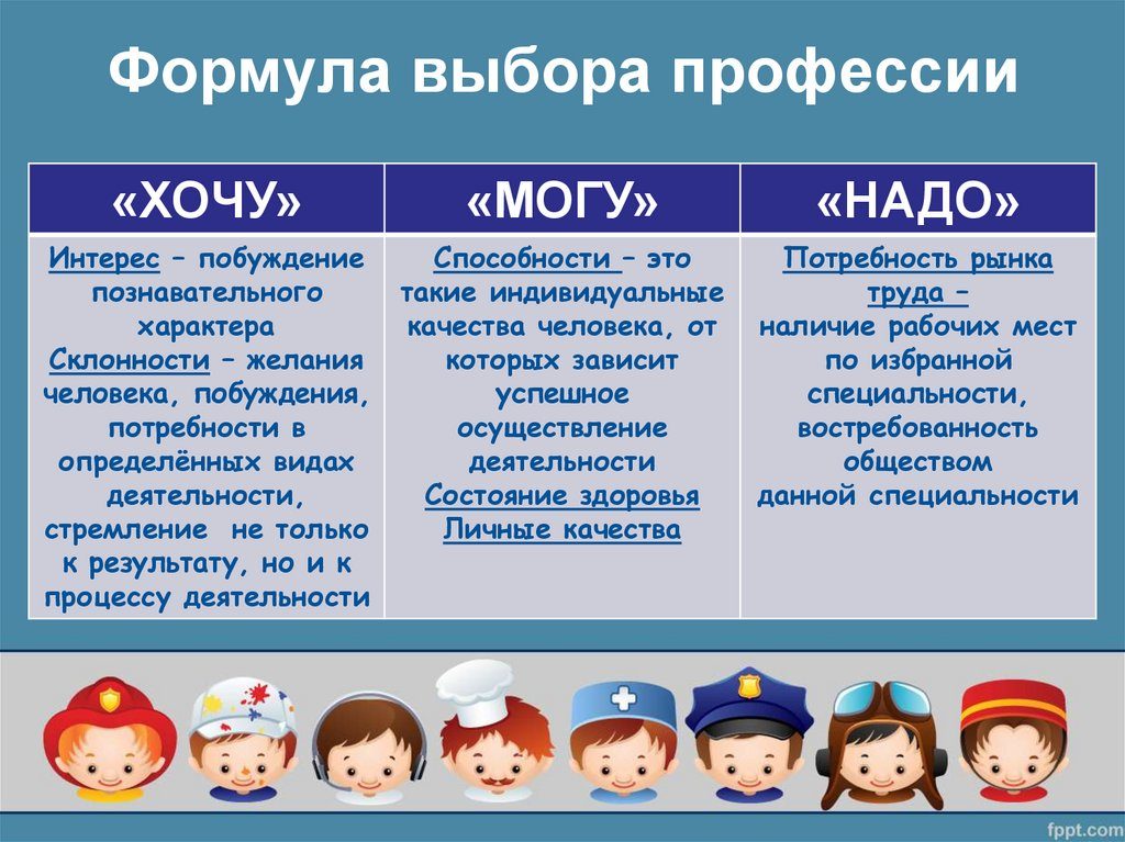 - Третий фактор – «Надо»Узнайте, будет ли востребована выбираемая профессия на рынке труда и где можно получить профессиональное образование по избранной специальности.
