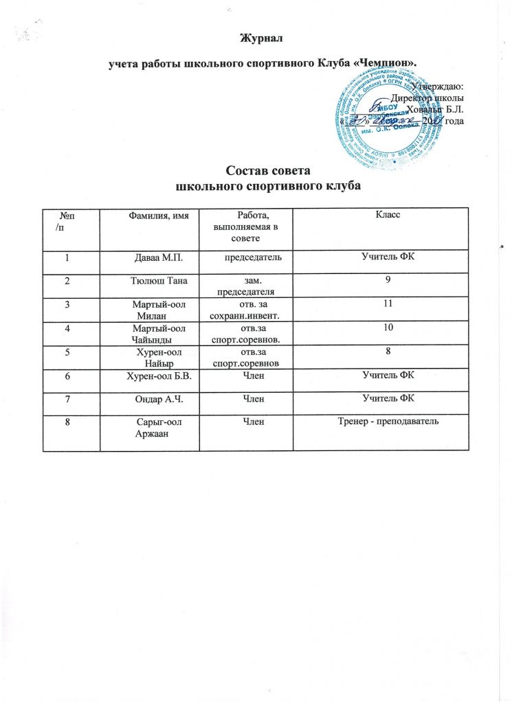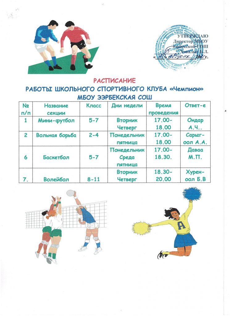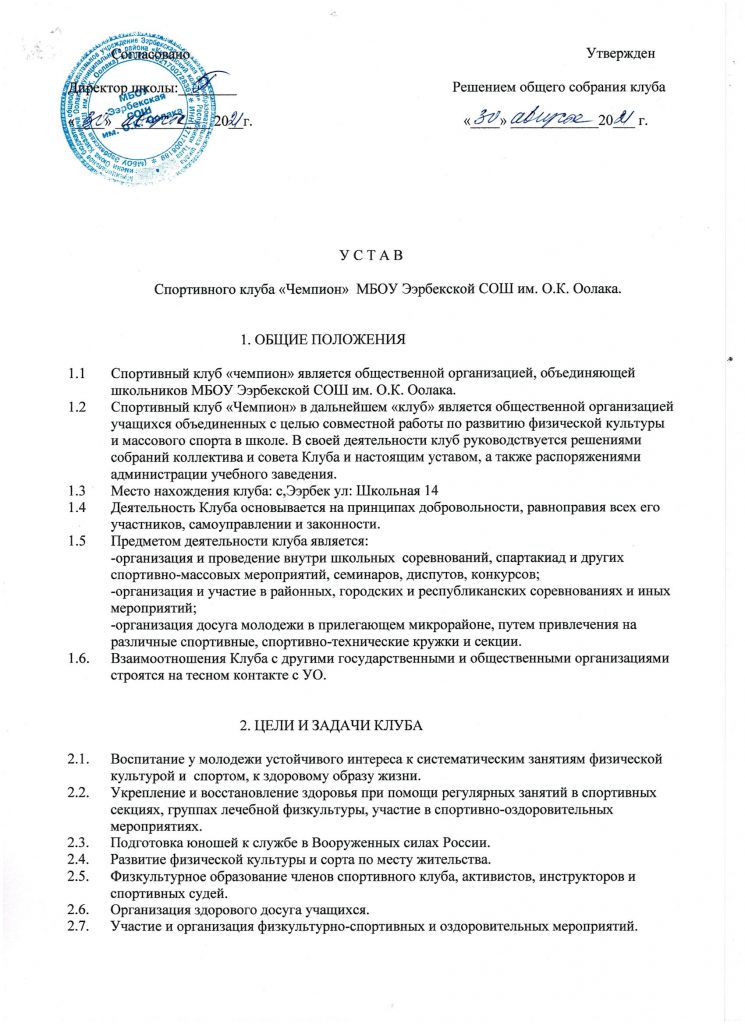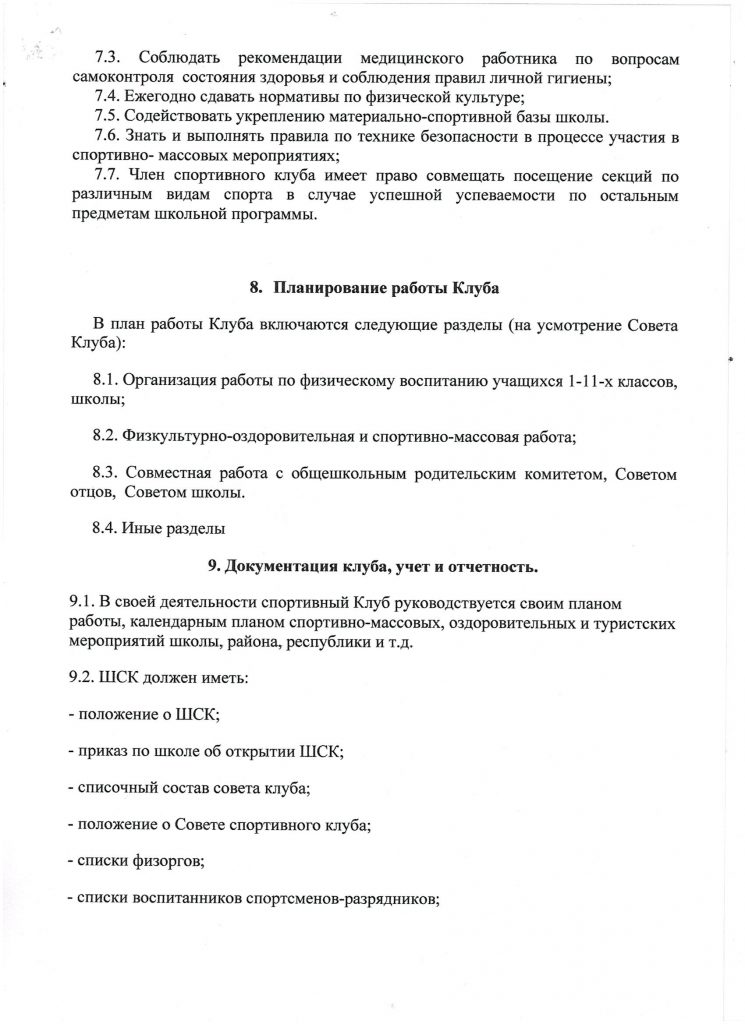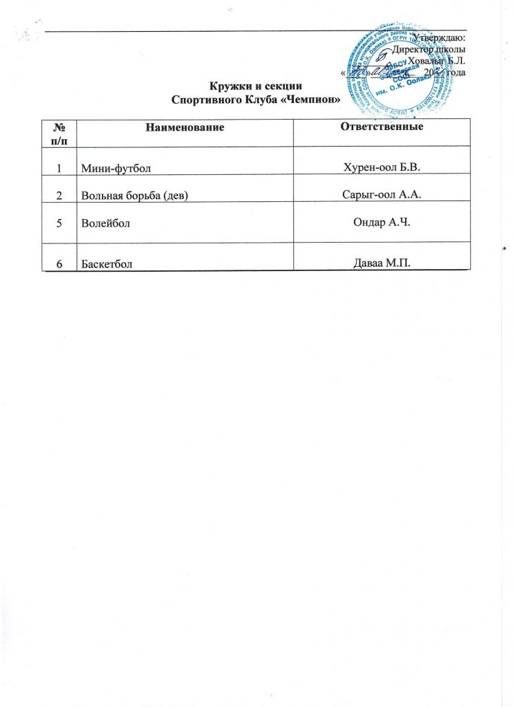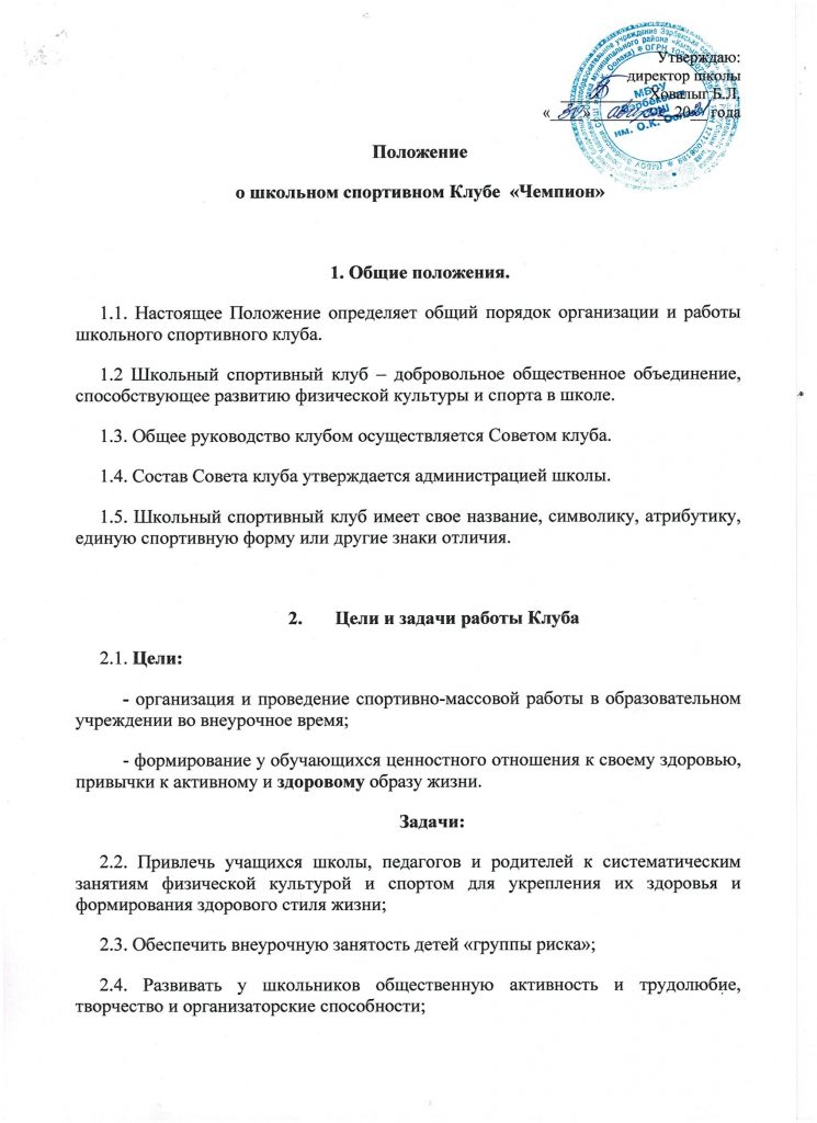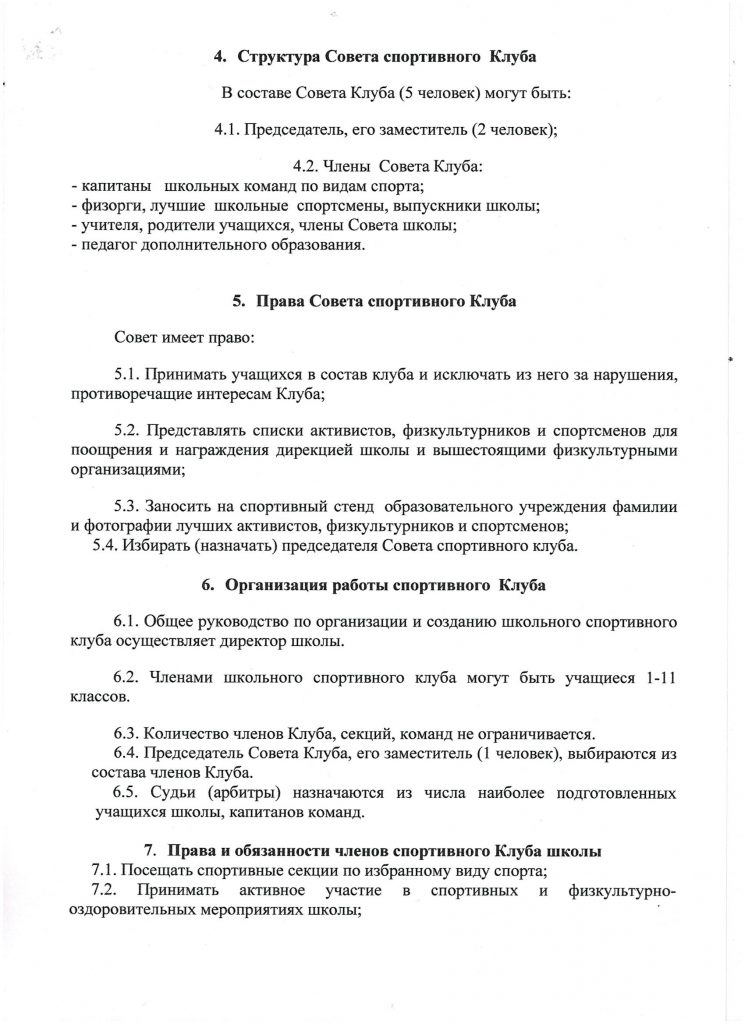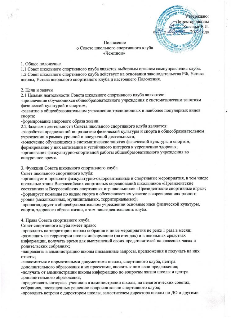 Школьный спортивный клуб «Чемпион» Приказ об открытии ШСК на 2023-2024 уч.год Скачать Положение о ШСК на 2023-2024 уч.годСкачать Устав Спортивного клуба «Чемпион» Скачать План работы ШСК на 2023-2024 учебный годСкачать Кружки и секции Спортивного клуба «Чемпион»Скачать Расписание работы ШСК «Чемпион» на 2023-2024 уч.годСкачать — лицензия на осуществление образовательной деятельности по виду образования «дополнительное образование детей и взрослых»; Скачать — приказ о создании ШСК; Скачать — положение о ШСК;Скачать — протокол съезда (конференции) о создании ШСК;Скачать — устав ШСК;Скачать — план спортивно-массовых, физкультурно-спортивных и социально-значимых мероприятий на учебный год; Скачать — расписание работы спортивной секций в ШСК;Скачать — календарно-тематическое планированиеСкачать